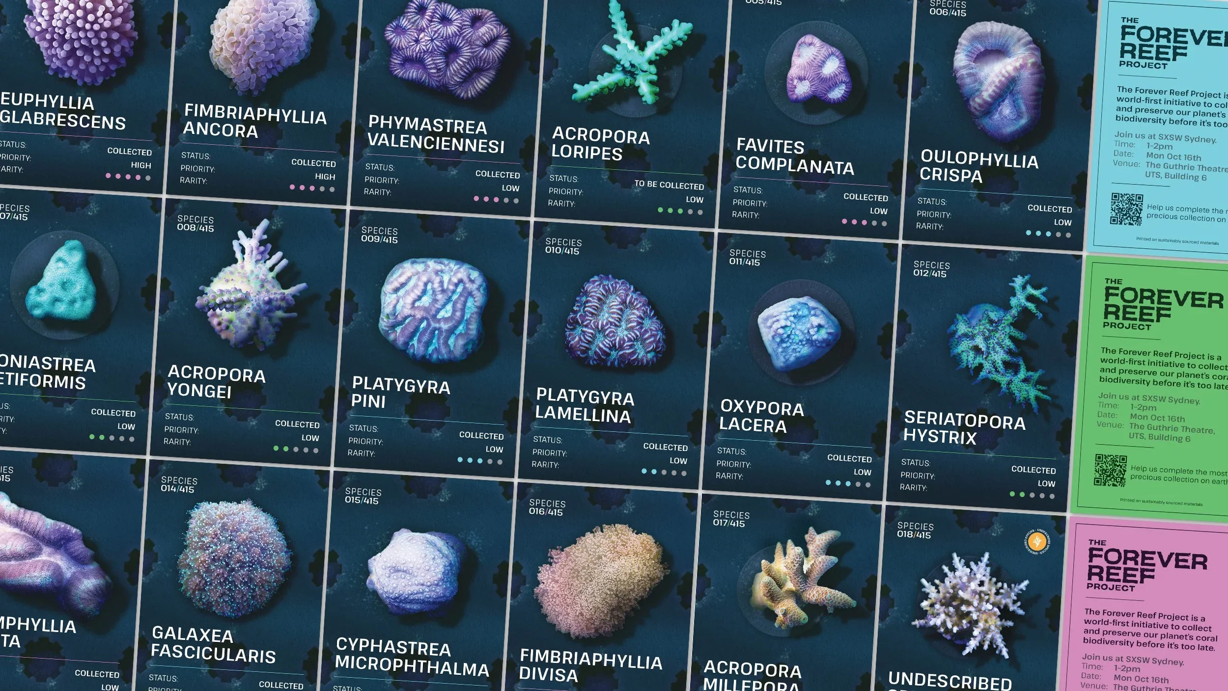 Finally we took the project to SXSW with an hr long panel discussion with the Godfather of Coral - Charlie Veron. As part of this, we developed a series of 18 collector cards for 18 species. Over 10,000 of these cards were handed out across the SXSW week.